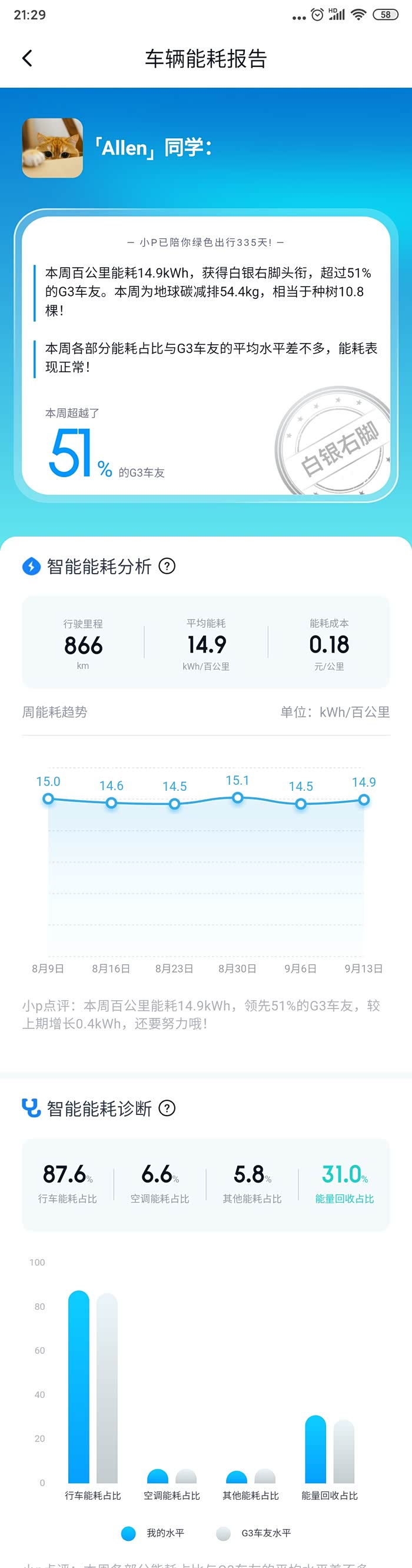 来看一下我的能耗,我一般喜欢用运动模式或者标准模式,此图是最近的情况,冬天的空调能耗会更大,大概占7-10%,春秋会好一些,大概2%左右。平均看下来大概百公里15度电左右,家用充电桩5毛5,大家可以算一下。