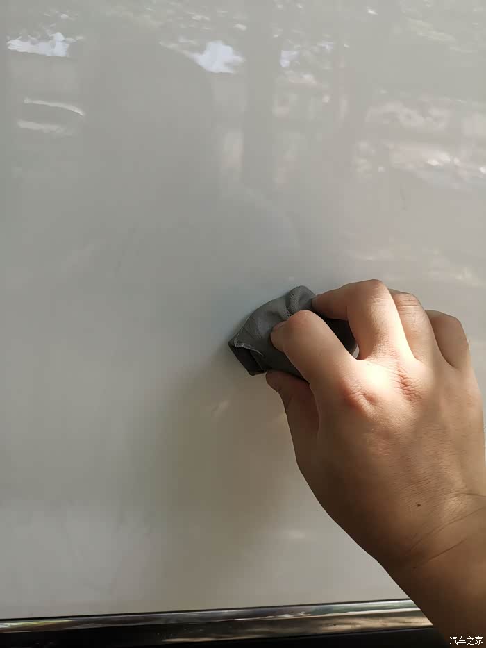 第三步,使用漆面清洁粘土,配合粘土清洁剂,仔细的摩擦漆面的每一个角落,做完这一步后,就会发现车辆的黄点顽固污渍,全部去除漆面光滑如新,是不是看起来好多了。