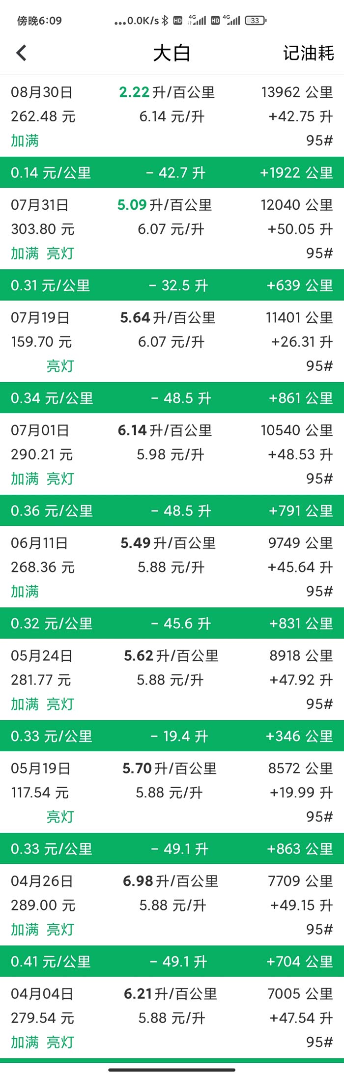 从8月1日基本是天天充电了,8月的费用是200元电费(1元1度电)加262的油费,跑了1922km,显示的油耗是百公里2.22升/百公里