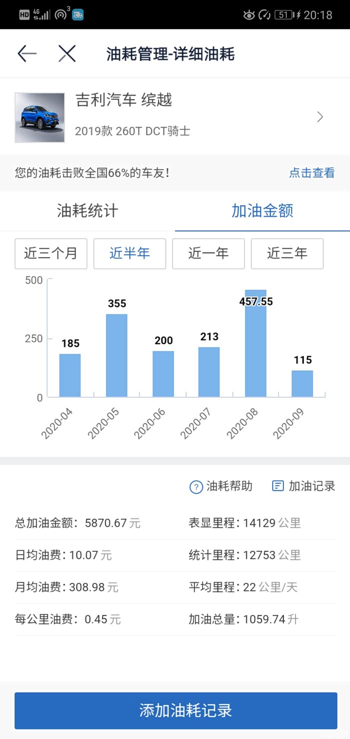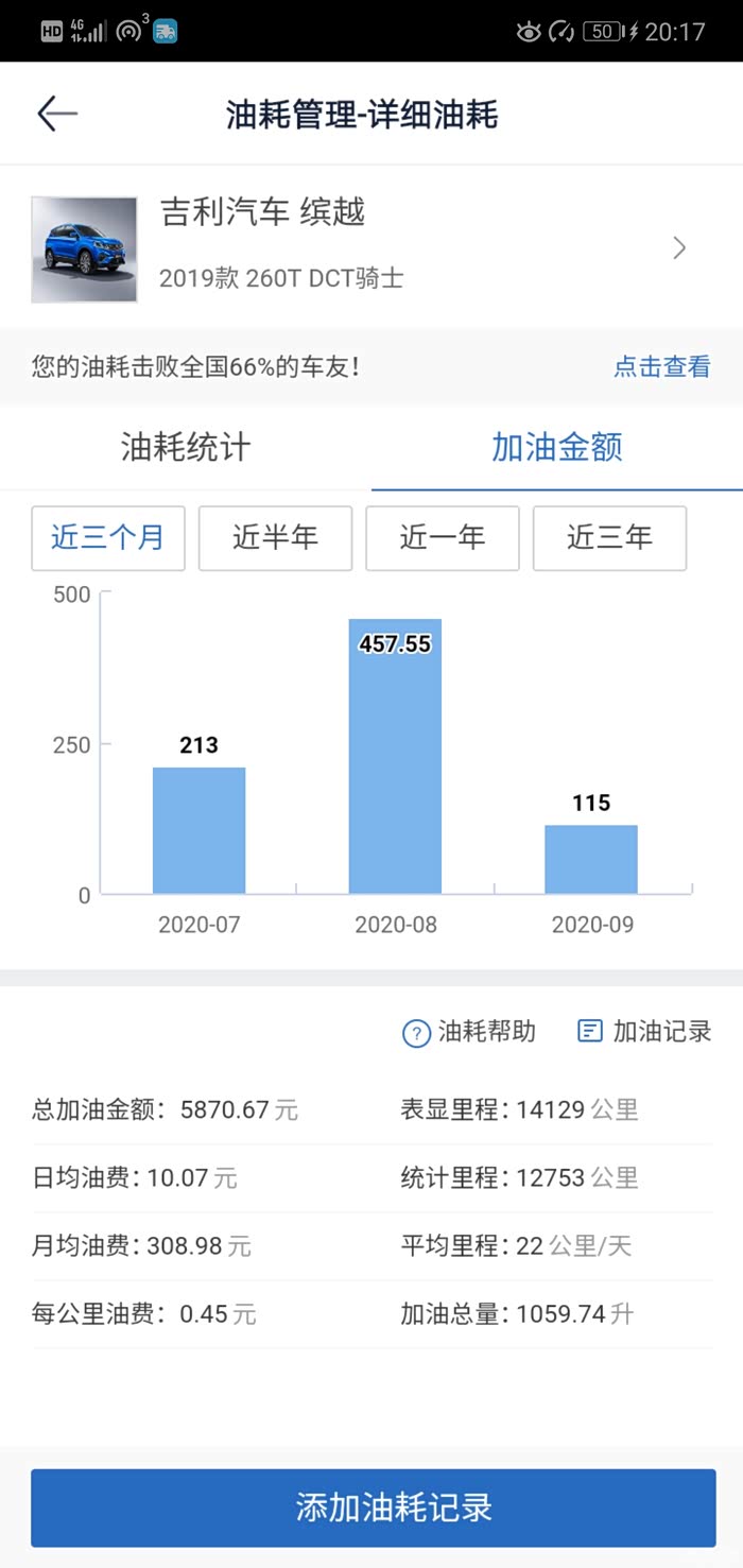 然后每个人的驾驶习惯以及驾驶里程和驾驶路况都不一样,所以说,即使是同一款车,我们的平均油耗也多少有所区别,所以说别人的油耗只是一个参考,重点还是要根据我们自己的情况来算出我们的平均油耗,不过作为一台suv来说,一公里也就是不超过五毛钱左右,这个价格我们都是可以接受的,一个月也就是几百块钱的油耗,但是它可以给我们带来很多方便和便捷。