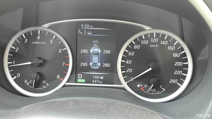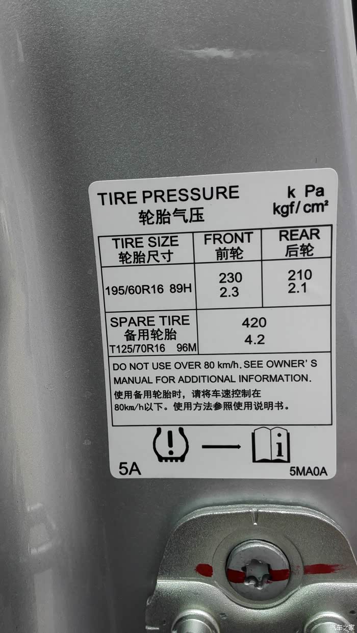 车到4S店时表显5公里,提车时表显已经跑了8公里,平均油耗43.4。胎压表显示前后胎压是320和310,随着天气温度和轮胎温度变化会有10个点的变化,标准是前230后210,懒得调,等首保让小工再调吧。