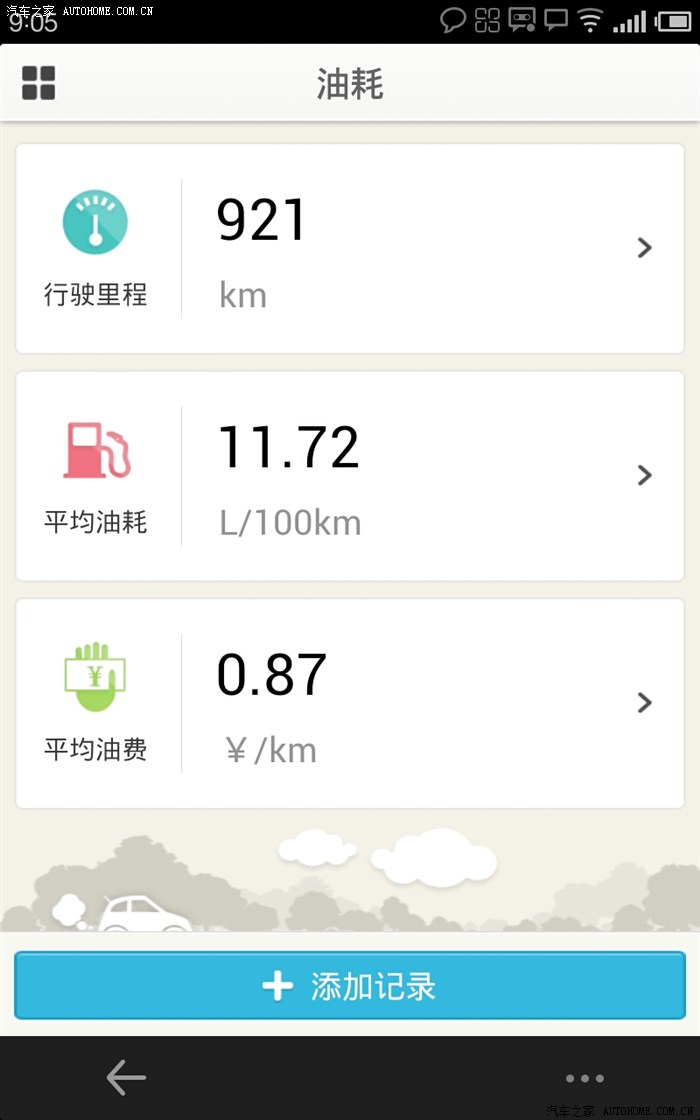 【加油站之家】软件测得,11.72L/100KM,每KM成本0.87。