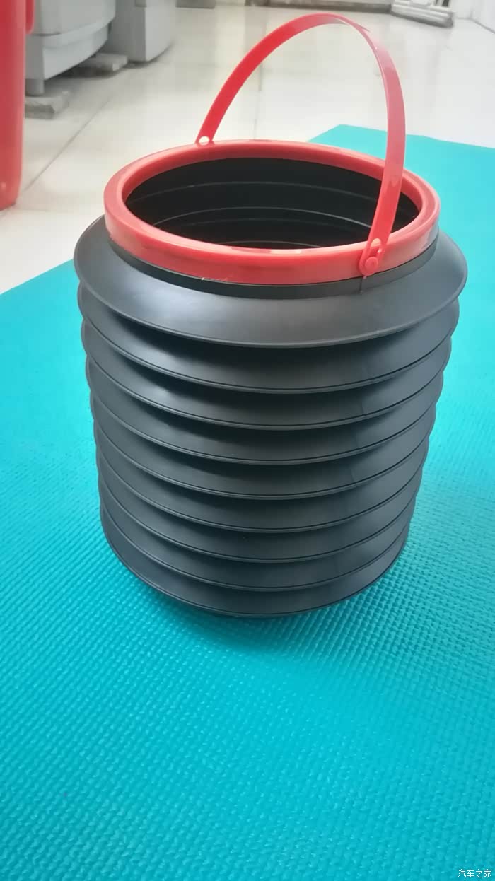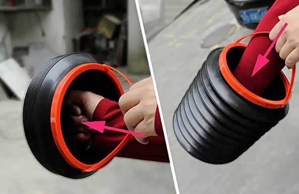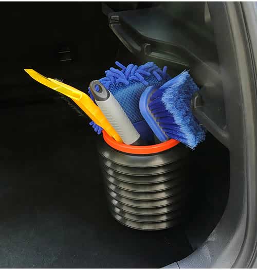 这是一款可伸缩车载垃圾桶,桶体中间具有拉伸褶皱部,拉伸褶皱部采用PP改性聚丙烯制成,桶体一侧通过铆钉铰接有与桶体相配合的桶盖。本实用新型的可伸缩车载垃圾桶通过调节垃圾桶的可伸缩部分来改变桶体容量,垃圾较多时可以将可伸缩部分伸长,以满足人们的需要,垃圾较少时可以将其缩至最短,以节省车内空间。