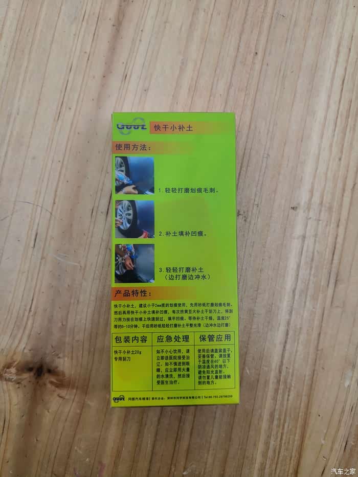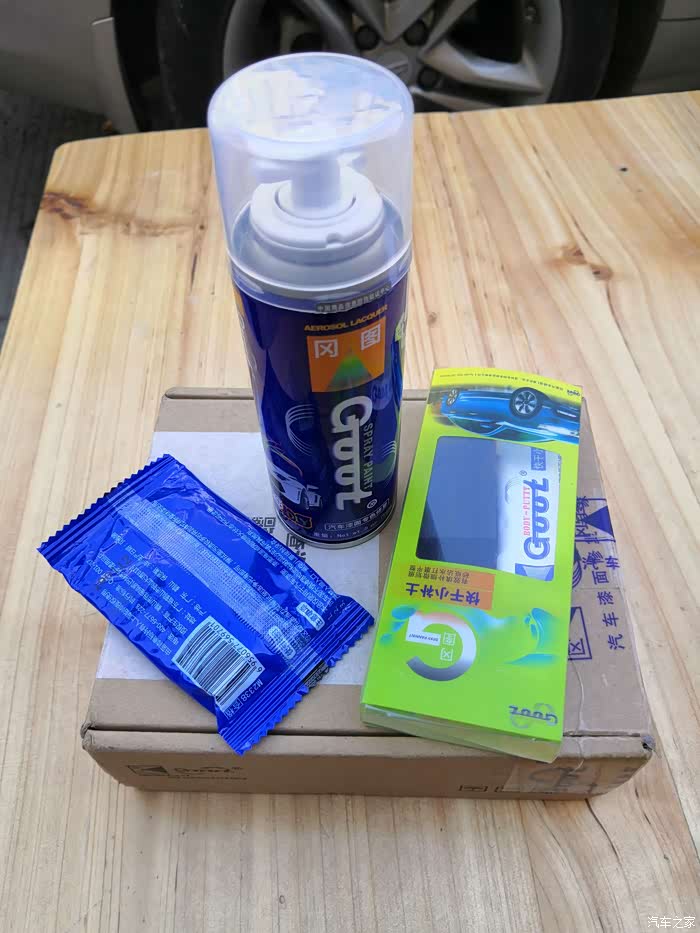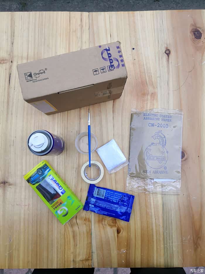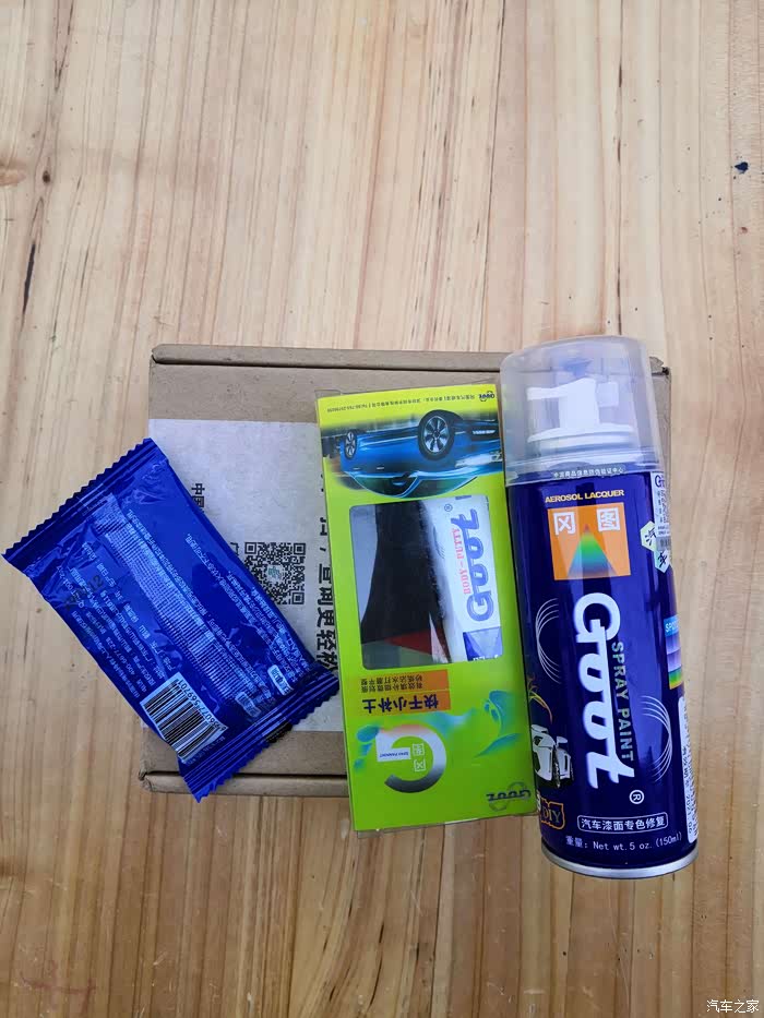 套装预览:腻子1支,喷漆1罐,去污泥1包,胶带1卷,隔绝薄膜1包,细砂纸和喷漆测试纸若干。