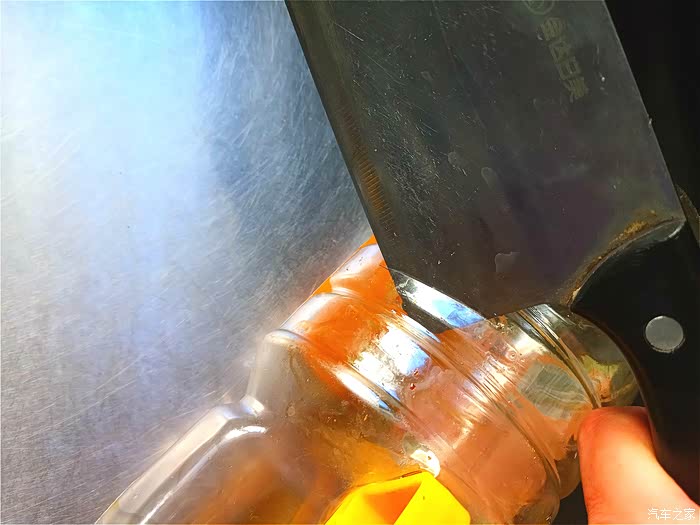 这了废弃的个豆油瓶子,先用刀来个口子再说。