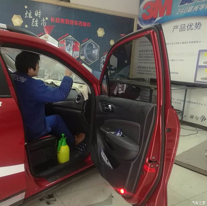 贴驾驶室一侧的侧挡玻璃膜,就是喷加了洗洁剂的水在内侧玻璃上,然后贴膜上去。刮平···