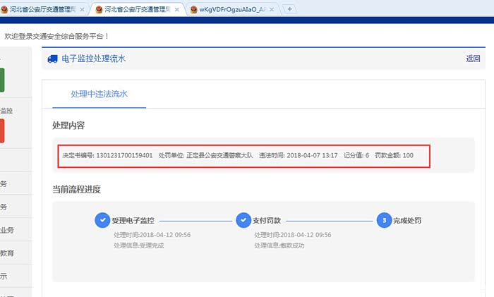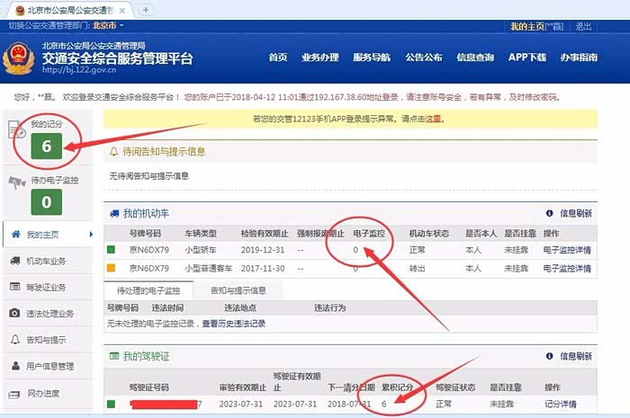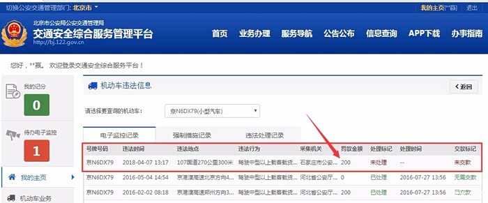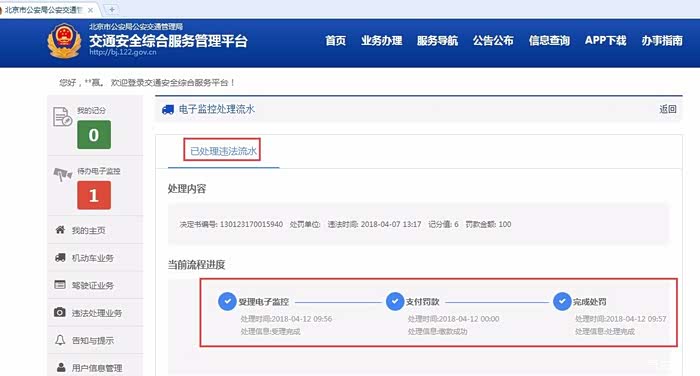 刷新平台,显示违章已经处理完成,同事驾驶证6分已经记上了。