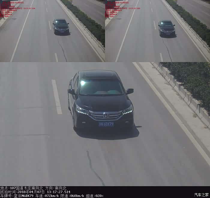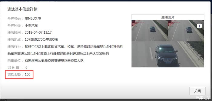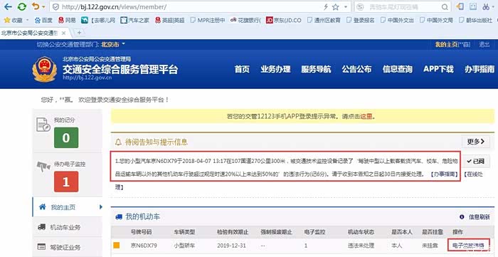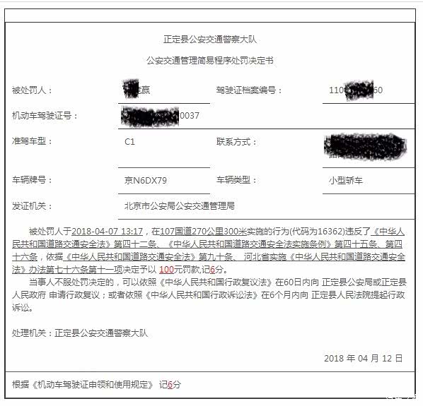 清明假期,跑了一趟西柏坡。今天收到信息“您的小型汽车京N6DX79于2018-04-0713:17在107国道270公里300米,被交通技术监控设备记录了‘驾驶中型以上载客载货汽车、校车、危险物品运输车辆以外的其他机动车行驶超过规定时速20%以上未达到50%的’的违法行为(记6分)。请于收到本告知之日起30日内接受处理。”一看,是异地超速了,进交管局网站一查,确认是我自己的车。