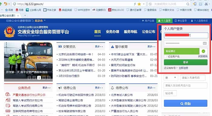 先登录北京市交管局官网http://bj.122.gov.cn,找到个人登录。如果没有账号,自行注册,然后绑定驾驶本和行驶本即可。