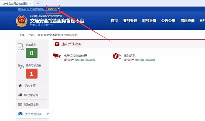 违法处理业务页面的左上角,有个地区显示。如果是在异地,在上面选择对应的地区。