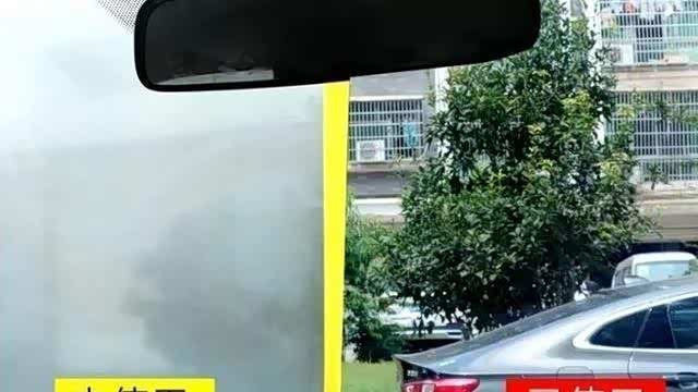 将防雾剂喷涂在汽车挡风玻璃上,然后再对着喷涂过喷雾的镜面喷高温水雾,我们可以清晰的看到对比。