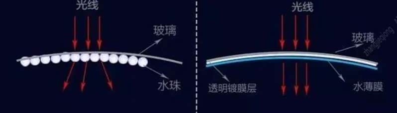 除了其防雾的效果之外,还有就是其强大的防雨效果,采用了荷叶效应原理,在玻璃和水的界面之间,建立持久疏水层,从而使水聚成水滴,迅速滑落,形成非常好的拒水效果。