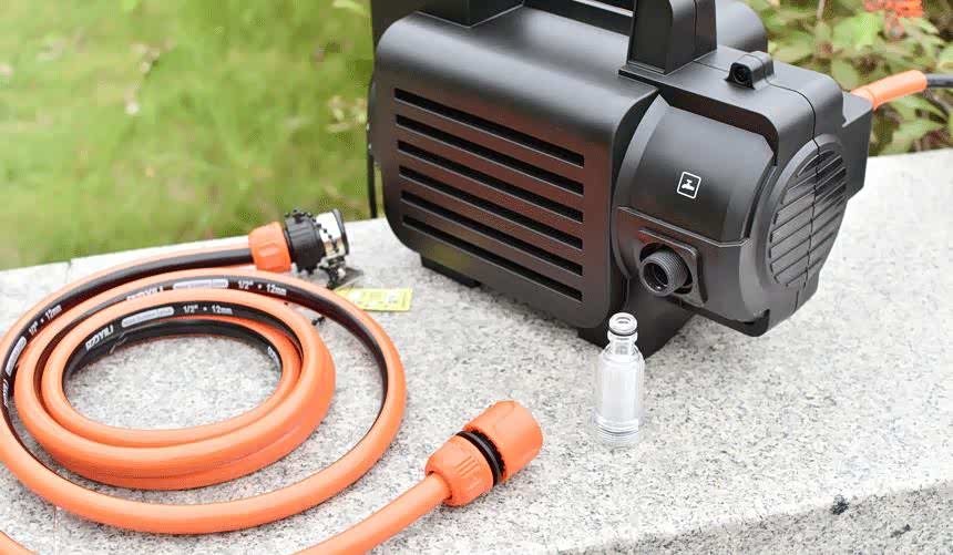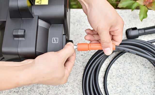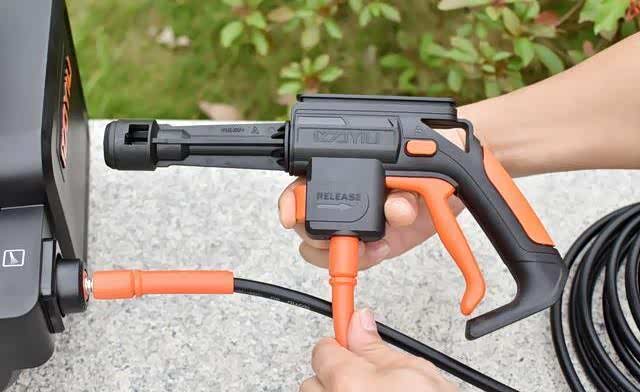使用前的准备,可先将水枪与黑骑士高压洗车机之间连接好出水管,水管的两端都是采用快插接口,按下接口处的卡扣插入水管即可,简单方便快捷。