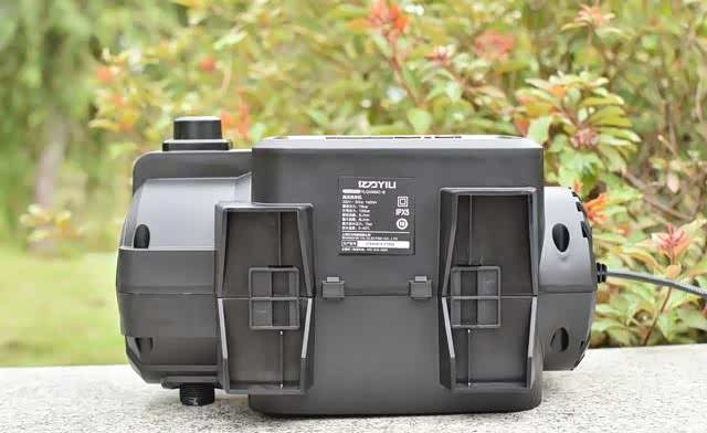 在机器的底部有原生注塑的塑料垫脚,可以平稳放置,另外在底部贴有一张印有产品名称和详细规格参数的不干胶贴纸,可以了解到产品的额定压力、流量和生产厂商信息。
