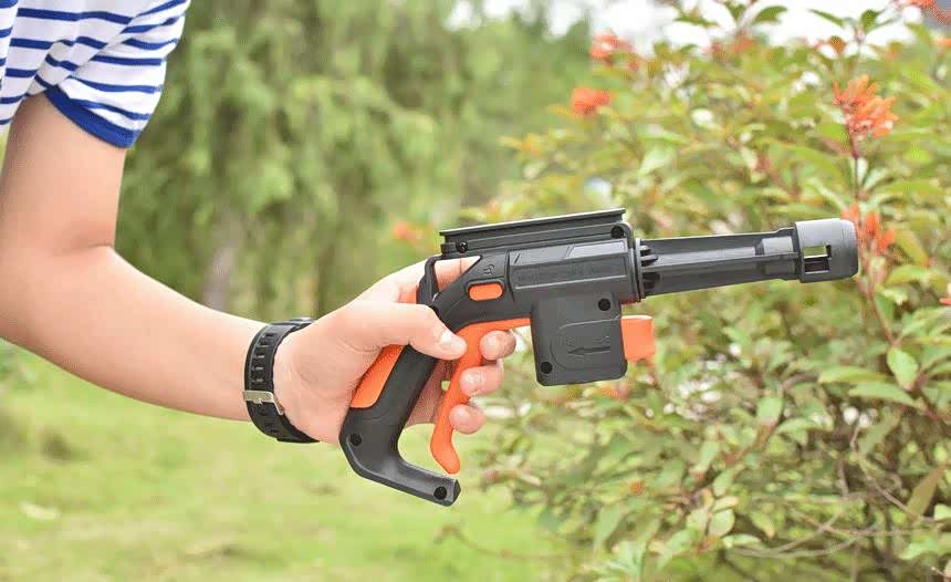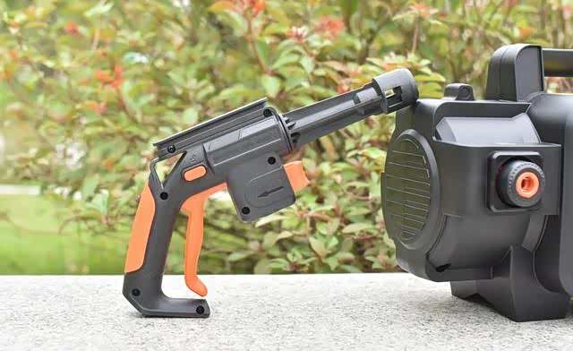 手持的出水枪柄采用短杆配置,与轻巧的机身搭配更加合理,而且该枪柄的外形是一个非常特殊的帅气造型,像极了一把左轮枪。轻巧的枪身方便手持,使用后可以收纳在一侧的挂扣上面,方便携带,安装方面也更快更便捷。