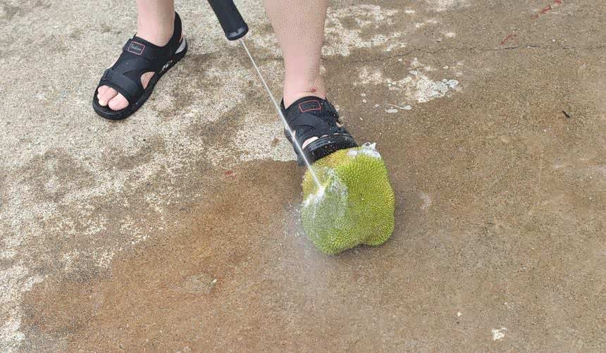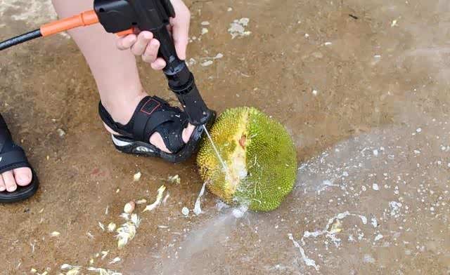之前看到过有用洗车机冲烂纸箱,用高压水柱来刮鱼鳞、切西瓜等,都是为了直观展现洗车机压力的。碰巧院里的菠萝蜜掉下来一个,还未成熟的菠萝蜜可比西瓜硬多了,所以尝试着挑战一下能不能将其切开,可以看到来回这么一冲,效果还是比较明显的。