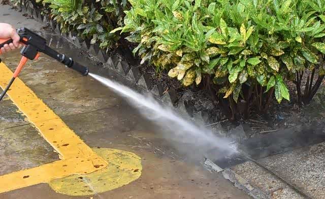 枪柄与喷头连接后就可以开始使用了,使用前要等机器与水管里面的空气排空后才可以正常出水,短喷头的操作半径短,使用起来会比较轻松一些。通过实际的效果来看水压非常大,旋转喷头可以调节水柱和扇形、雾状喷水效果,试了一下即使调节到扇形的雾状效果喷到手上也会有点疼,所以在使用过程中要注意身边的人,尤其是旁边有小孩的时候要记得启用防误触锁扣。