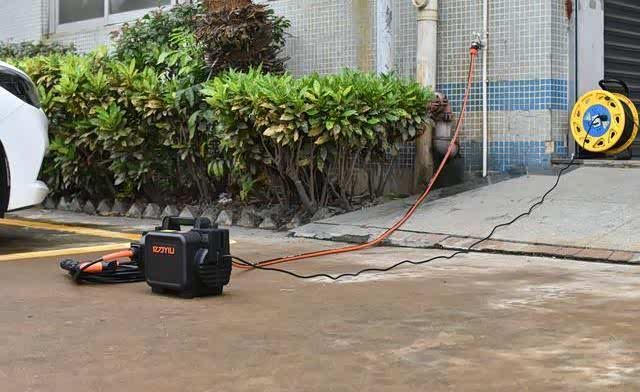 停车的位置刚好有一个水龙头,而且进水管的长度也差不多,所以接上就可以了。至于用电方面,弄了一个50米长的移动电缆盘,长度应该足够,现在天气也比较炎热,洗车的时候可以开到比较干净阴凉的地方慢慢清洗。