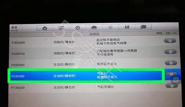 修车师傅为了快速确准故障问题的根源,使用诊断仪对行车电脑进行了故障诊断,如下图所示;在行车电脑中一共诊断出来5个故障码,修车师傅介绍,其他4个故障码暂时不用管,绿色区域标注的汽缸3检测到不发火故障才是最主要的。