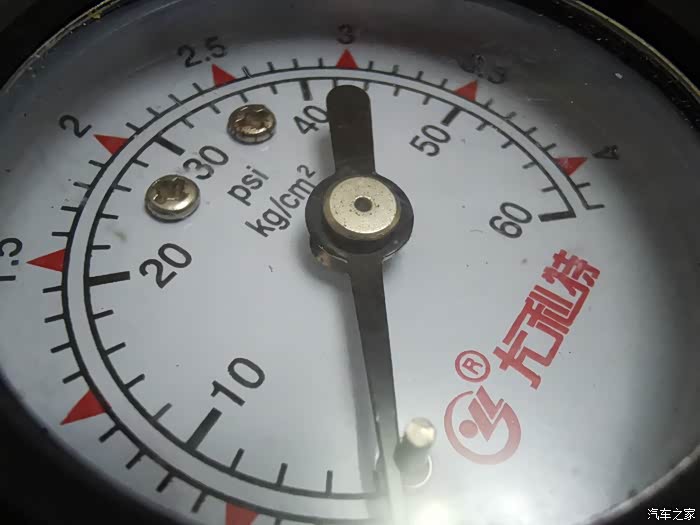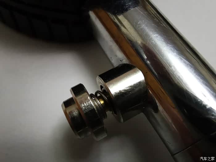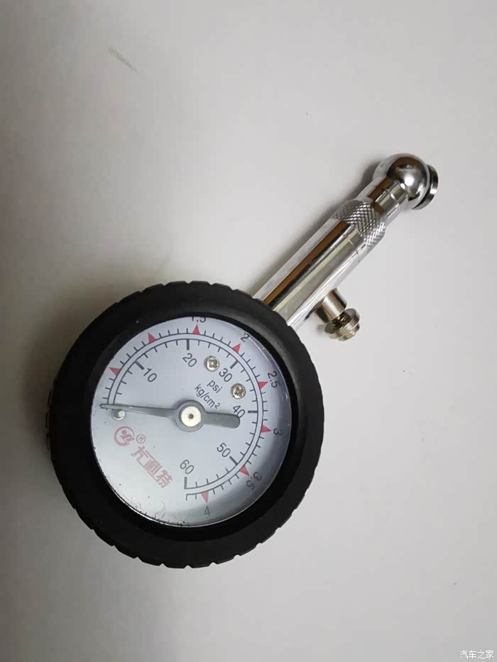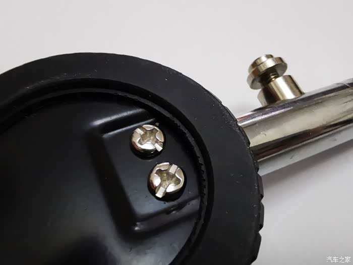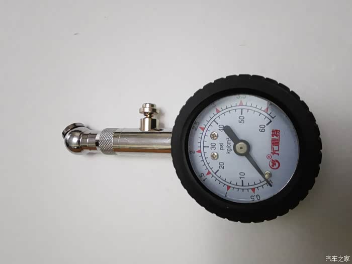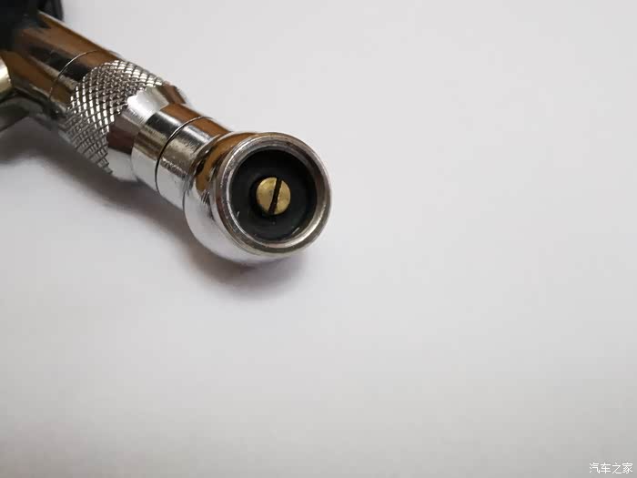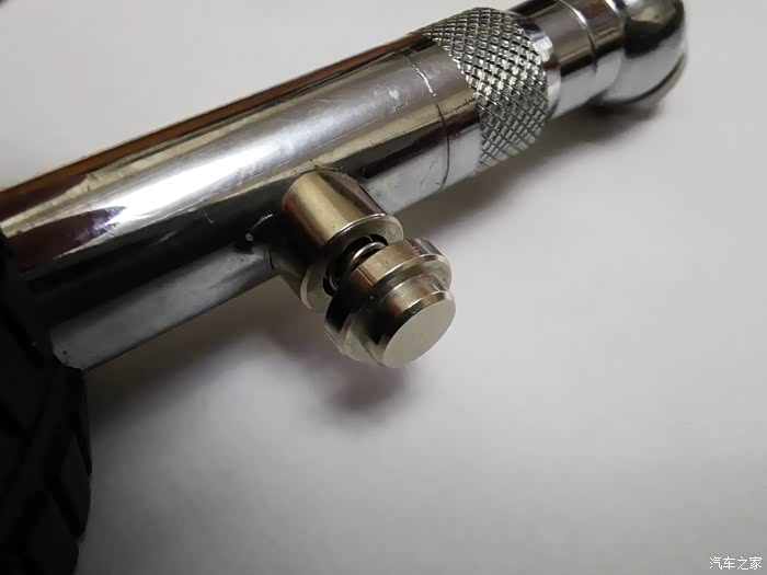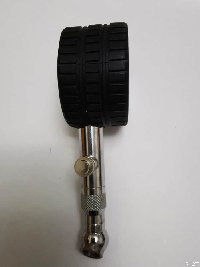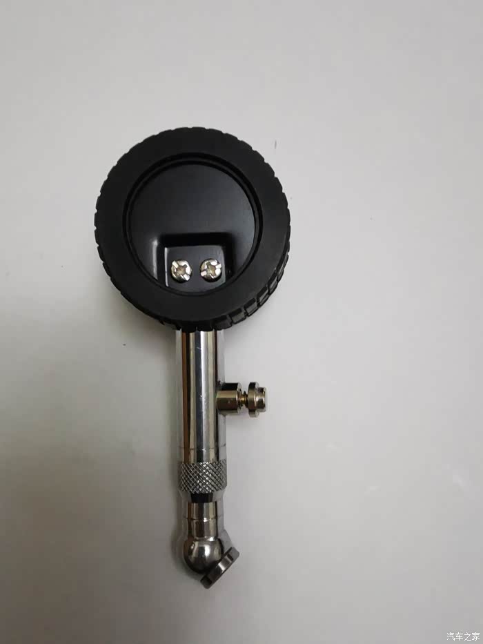 在铝合金连接气管的侧部,设有放气归零阀门,其主要是用于胎压过高放气用,不是用来固定指针。观看胎压表的数值,需要连接上轮胎时直接查看,以便得到一个准确的胎压值。
