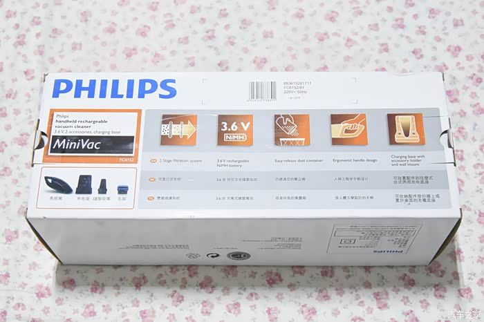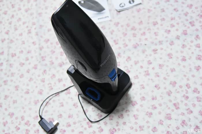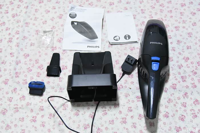 2、开箱后发现盒子内除了这款飞利浦无线吸尘器外,还配置了加长吸嘴跟毛刷吸嘴。并且还配备了一个充电底座。可惜呀要是U口的充电底座就方便了,这样就能在场上家里都可以充电了。这款底座的充电是220V双控插座充电器。看来产品更加适合家用。但我还是只在家充电在车上用。