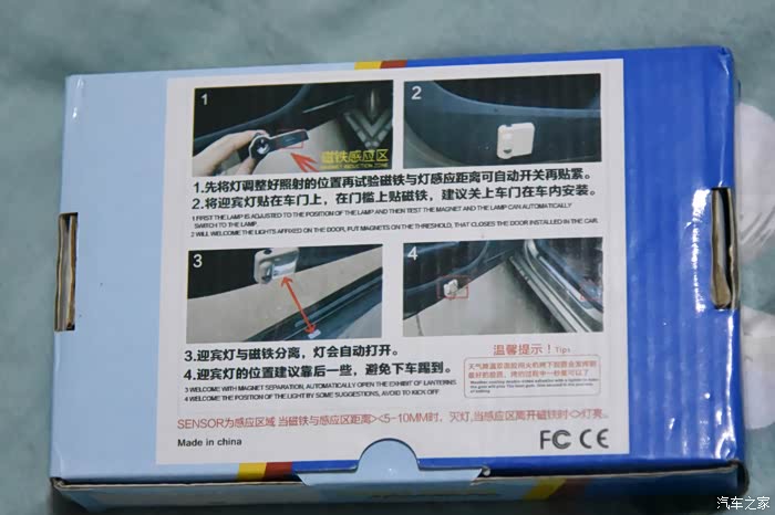 1、首先这款迎宾灯的外包装啥够可以明显的看出是贴牌产品,但是贴牌的位置遮挡了包装上的彩图,位置不合理影响整体的包装美观。