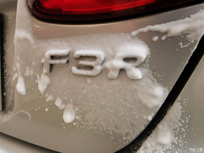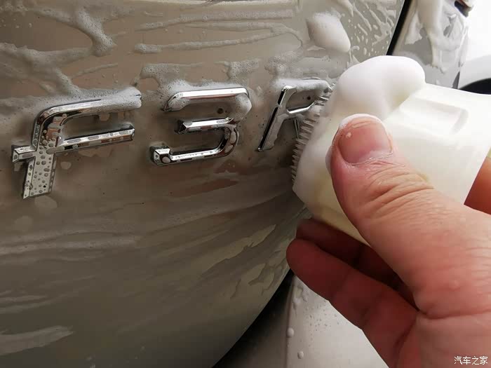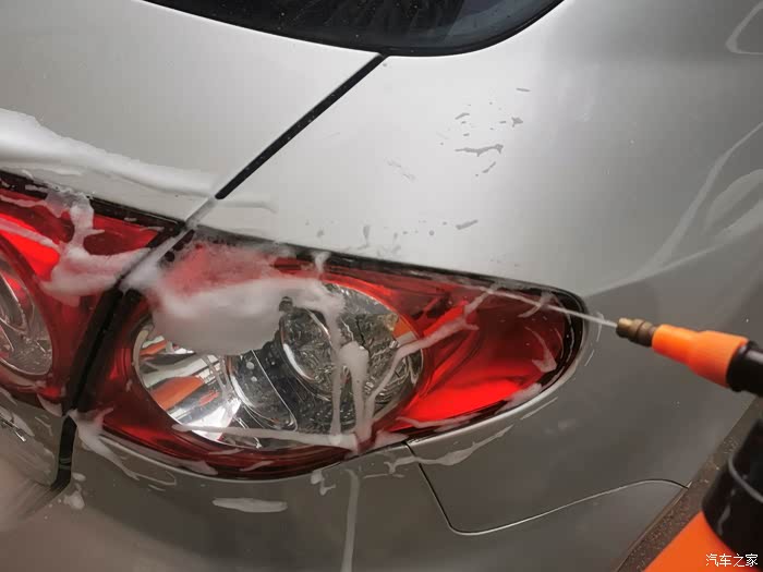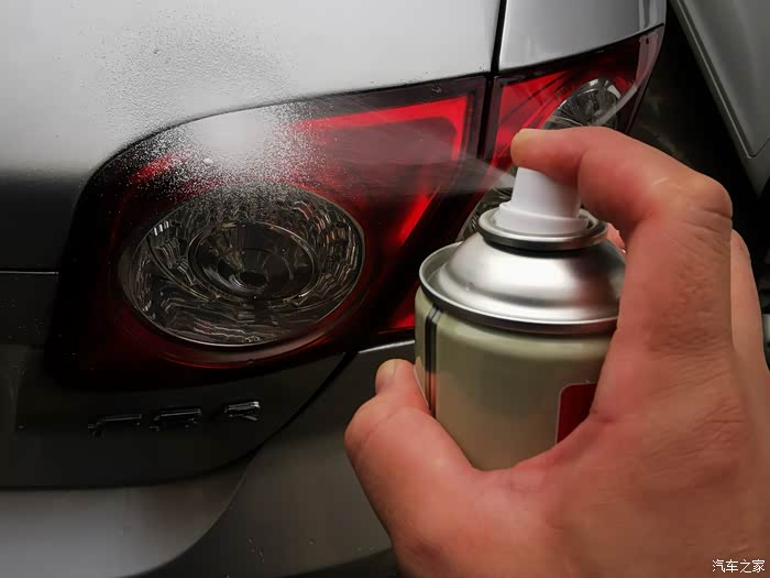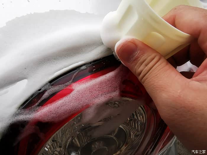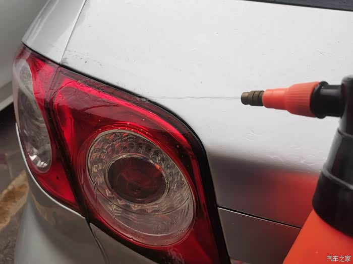 通过仔细观察,我们可以看到尾灯与车辆的缝隙中间有很多灰尘污渍的,看到这些污渍我们首先使用泡沫清洁剂给喷上。