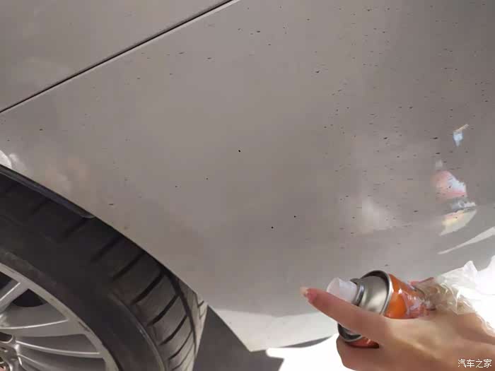 这是喷洒过大力橙喷剂的柏油污渍,已经开始融化了,然后用抹布擦拭干净即可,颗粒比较大的柏油污点可以擦拭之后再喷涂一点大力橙去污剂,再一次融化擦拭,然后车子上的柏油污渍就可以去除了。