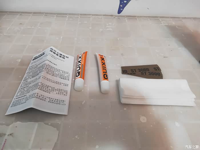 来一张全家福,整个产品包括1号修复剂、2号修复剂、无纺纸巾、3000目砂纸5小块以及说明书一份