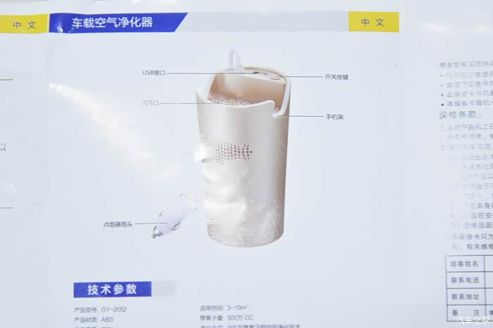 经过我的试用这款【固特异GY-2052型车载空气净化器】厂家说的什么500万等离子群空间净化技术、什么活性炭光触媒HEPA滤网。这些高科技技术我真的是没搞懂呀。还是捞干的说说我的试用感受吧。这款车载空气净化器是水杯形状的设计,所以可以放在车辆的水杯架内进行安装摆放,取电也十分的方便,并且这款车载空气净化器还能够当手机支架进行使用。它还设计了U口,可以外接连线对手机及平板电脑等进行充电,这设计真的是非常的不错。唯一的缺点就是旅行有点迷你只有几十平方厘米。