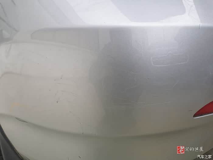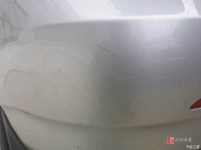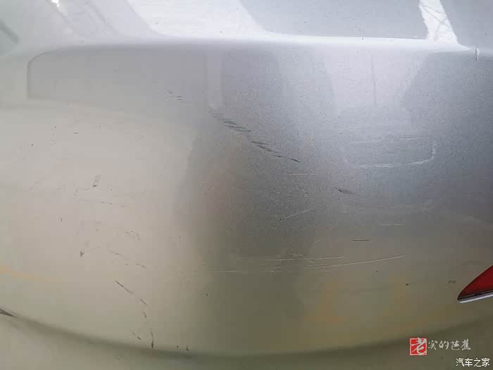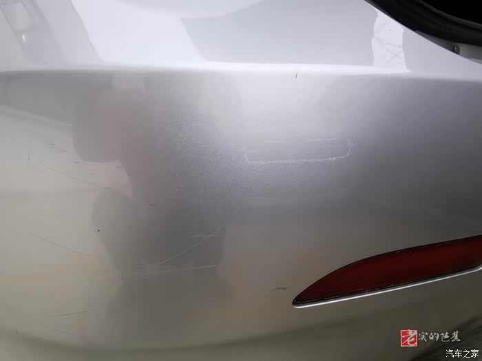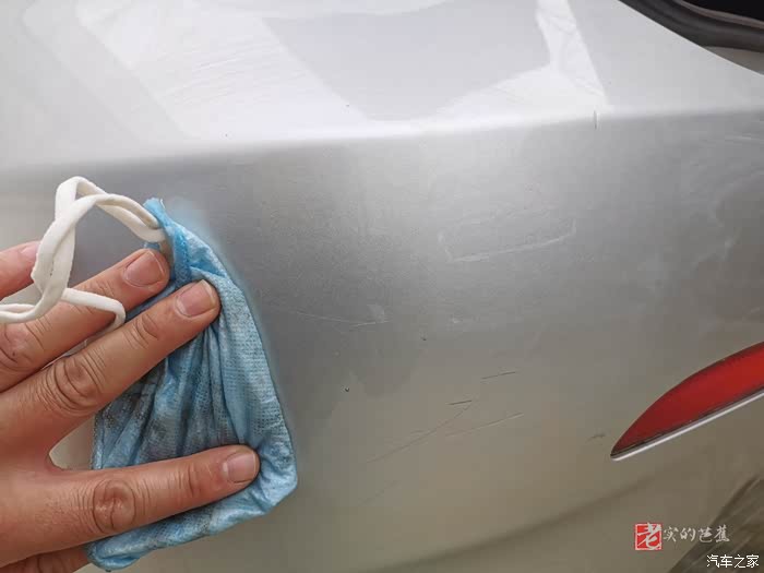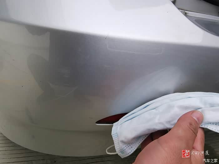 首先我们找到了在车辆后保险杠上有明显的划痕与污渍的地方,不过看上去分不清楚是污渍还是划痕了,不管这么多了,直接上蜡看看效果。