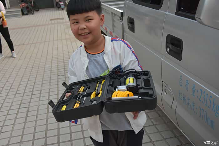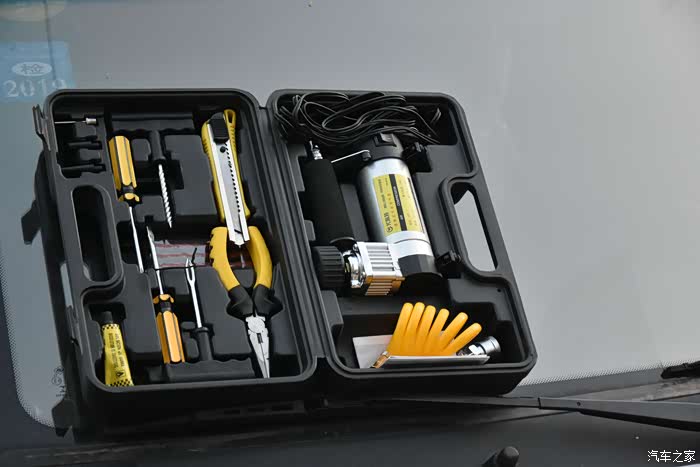 从图片中可以看到,这款工具箱除了日常使用的一些小五金工具之外,还有一台充气泵