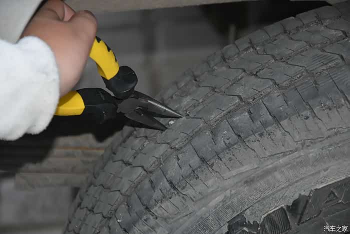 用尖嘴钳清理一下轮胎上面的小石头子