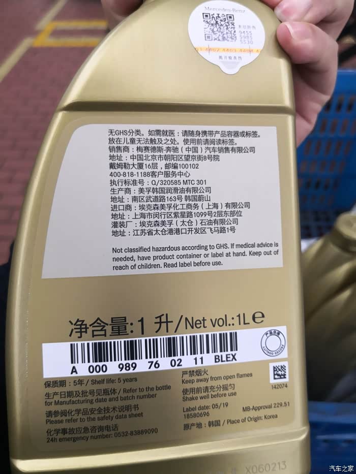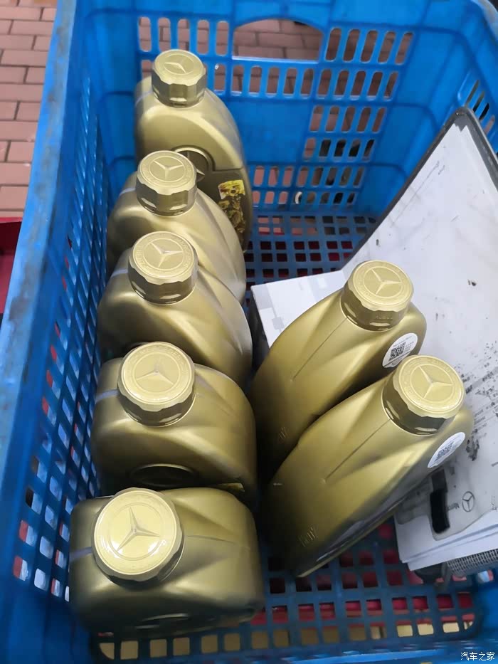 到了车间才知道机油不是大桶的,也是这种小桶,美孚代工,应该是金美孚吧,同样2.0T发动机,我的迈腾才加4.5升,好家伙这货2.0T发动机得加7升……