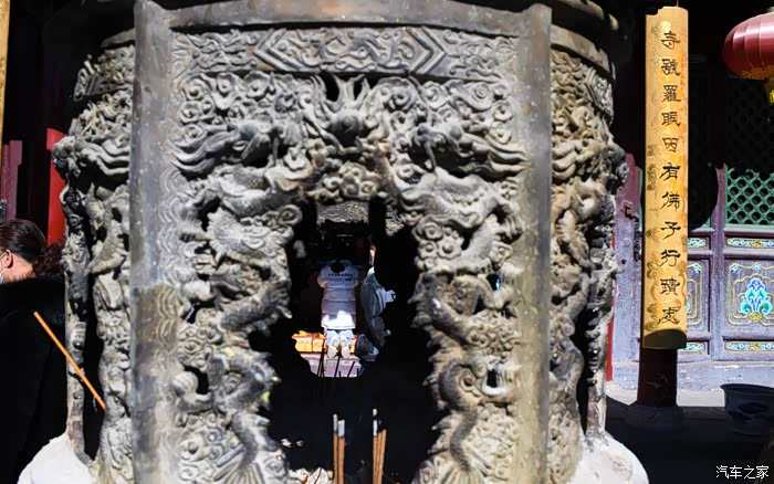 从香火炉的缝隙中拍到了正在虔诚求拜的游客。