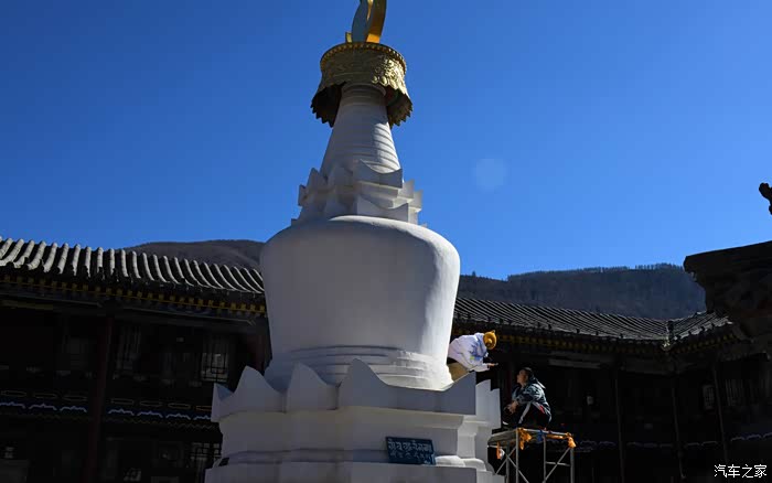 庙院内散落着各式各样的大白塔,图中是工作人员正在修补完善。