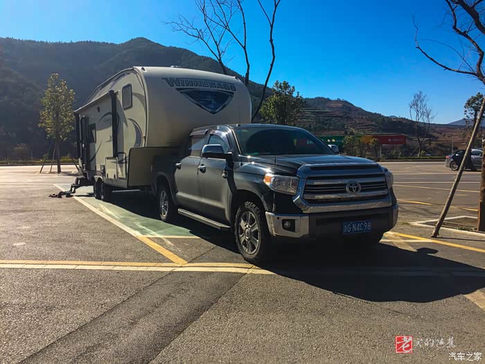 过了,向出发的路上:一路都是晴空万里,途中遇到一辆丰田坦途拖着一辆大大的房车。