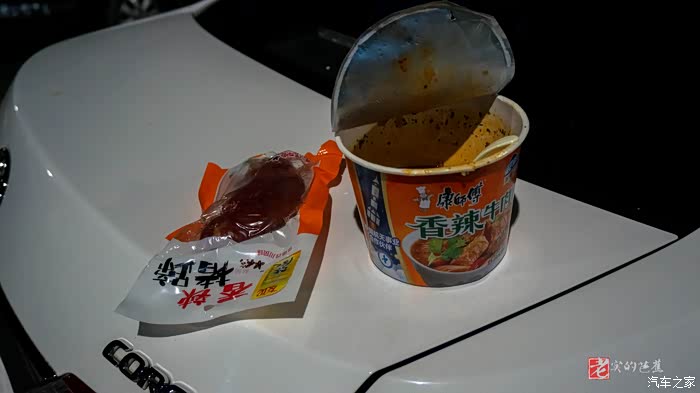 后备箱盖当桌子,这样站着吃完一包猪蹄+一桶方便面便非常满足。