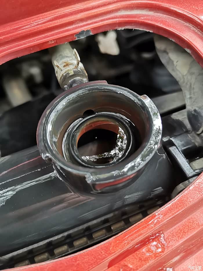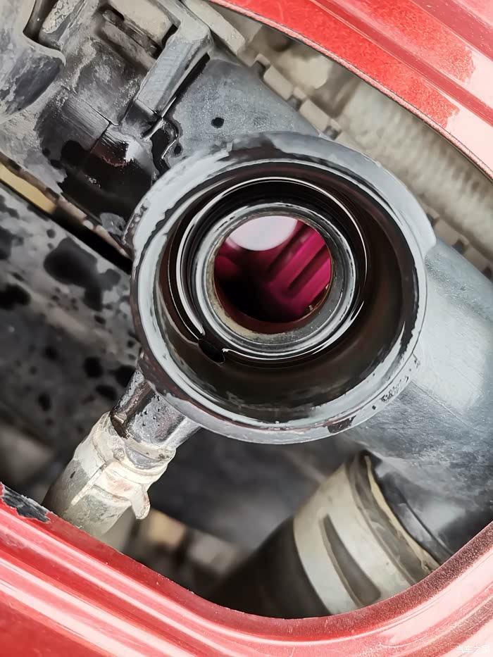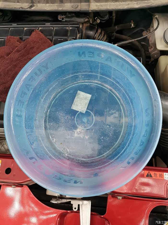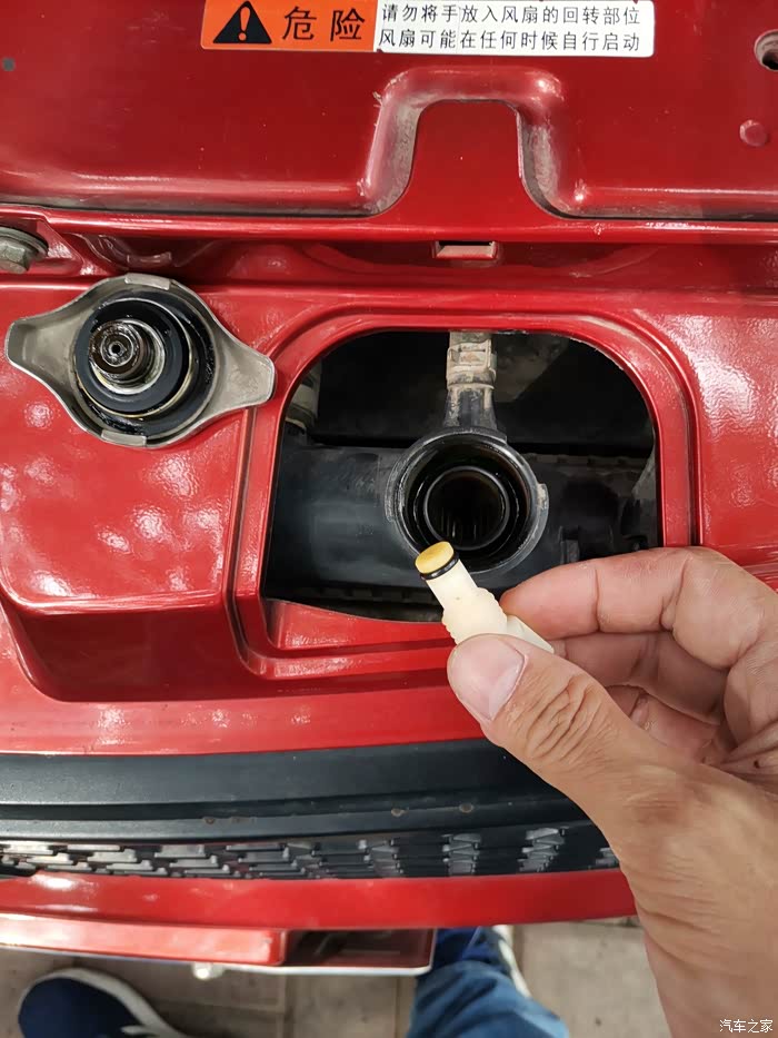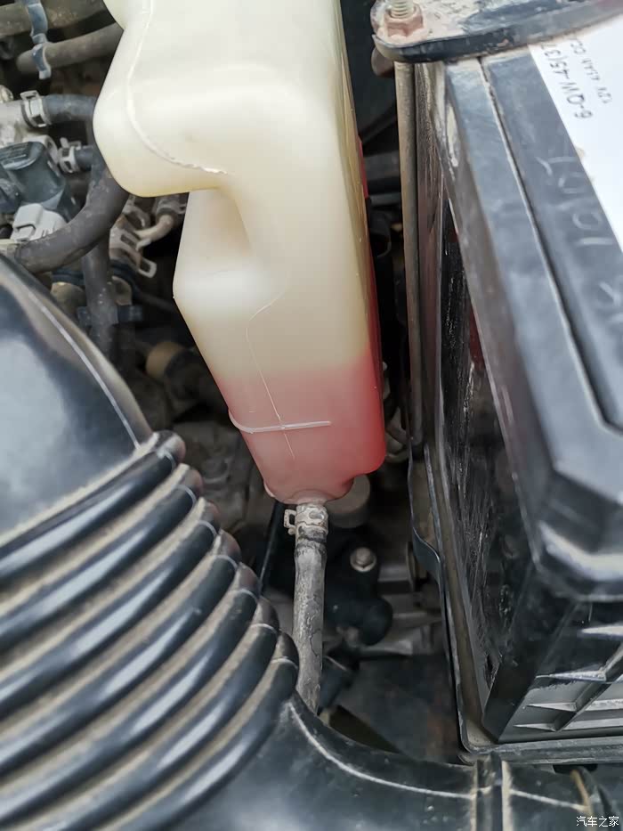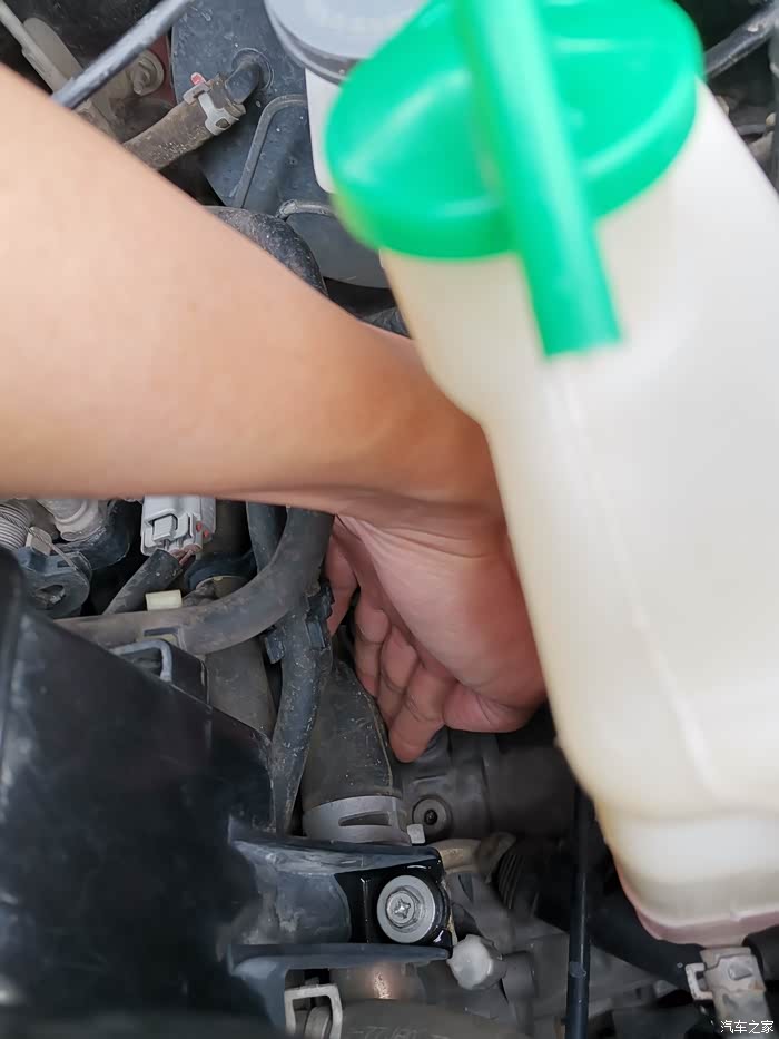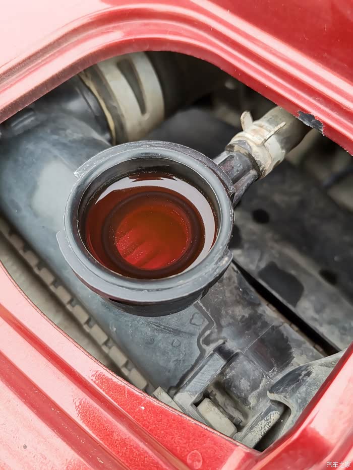 拧出放水螺丝后,把水箱盖拧开,放水也能快一点。水壶和导管提起来,让里面的防冻液也放完。检查放水螺丝密封圈是否老化、开裂,因为有人悲剧过→高速路上发现漏多了,一路加自来水。