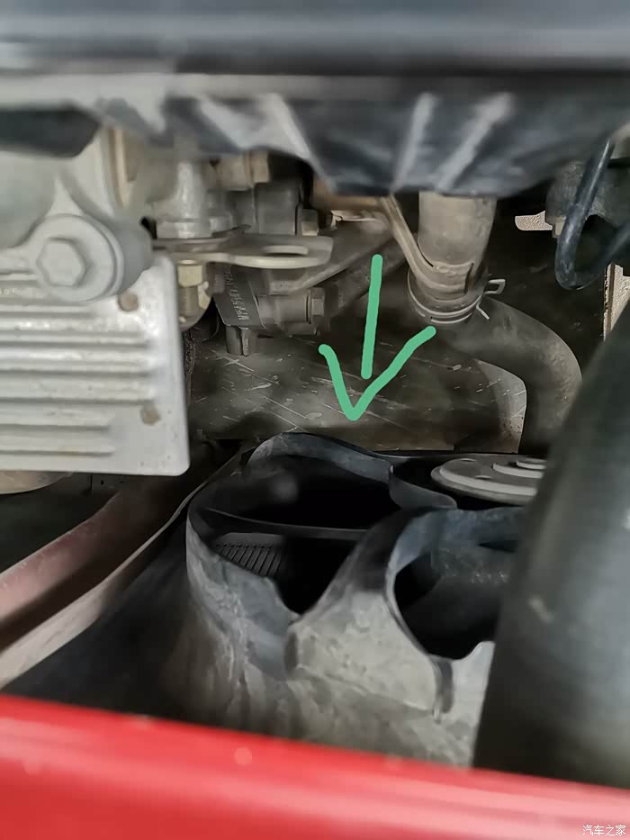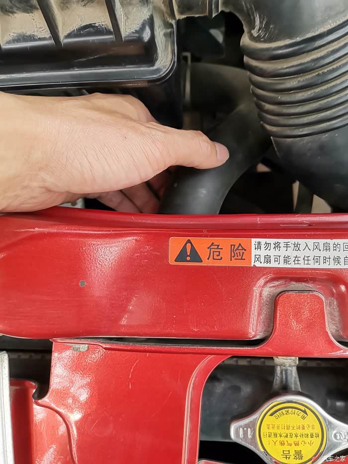 放水螺丝就在手指方向下面,风扇底下往前一点,手伸下去摸到短的圆管就能摸到放水螺丝。手贴近水箱一点,发动机烫,右手操作比较方便。