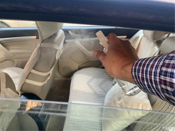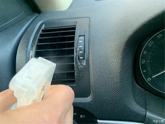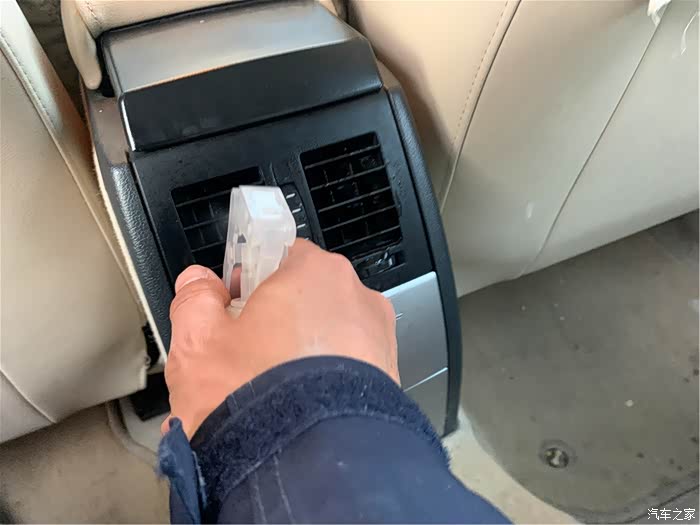 后排的空调出风口也喷入汽车消毒液。