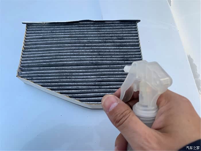 往空调滤芯喷洒汽车消毒液,随后安装好空调滤芯。