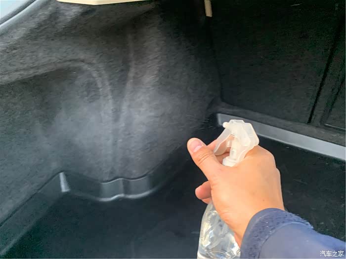 最后进行后备箱的消毒,打开汽车后备箱盖对后备箱内各个方向喷洒消毒。