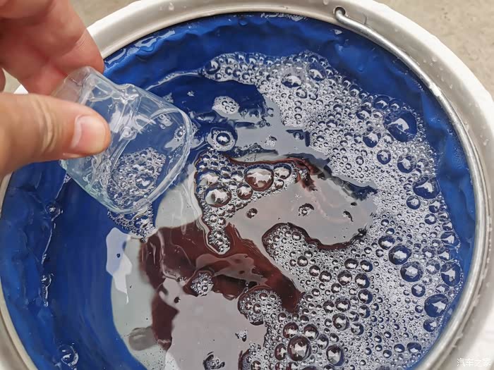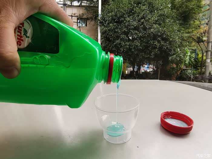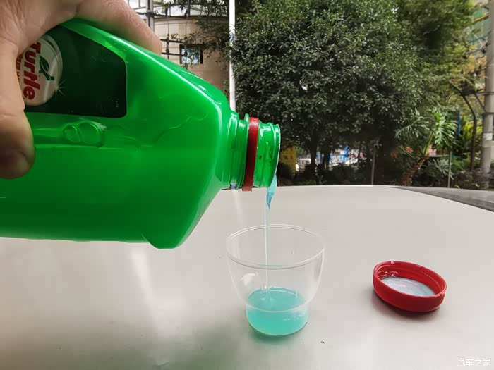 将洗车水蜡从瓶中倒出,可以看到呈现淡蓝色,状态为乳胶粘稠状。