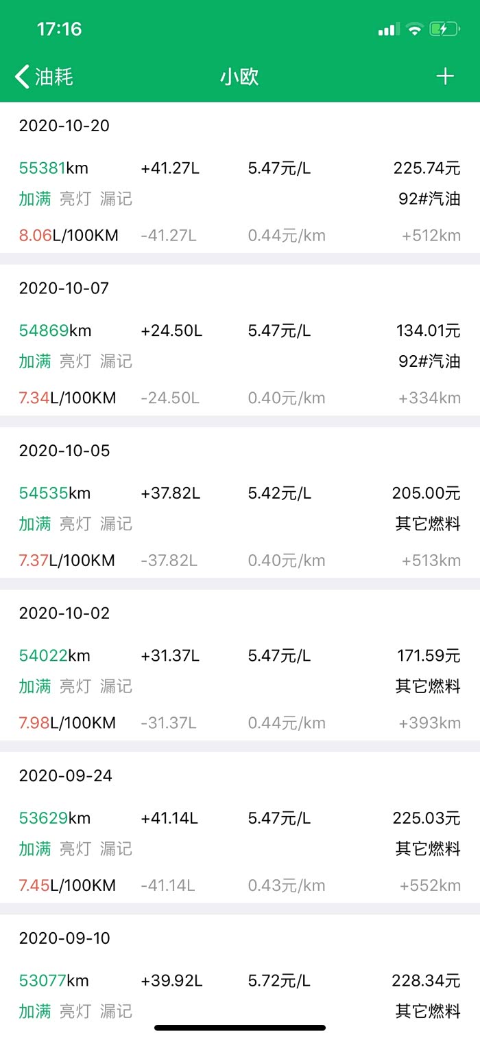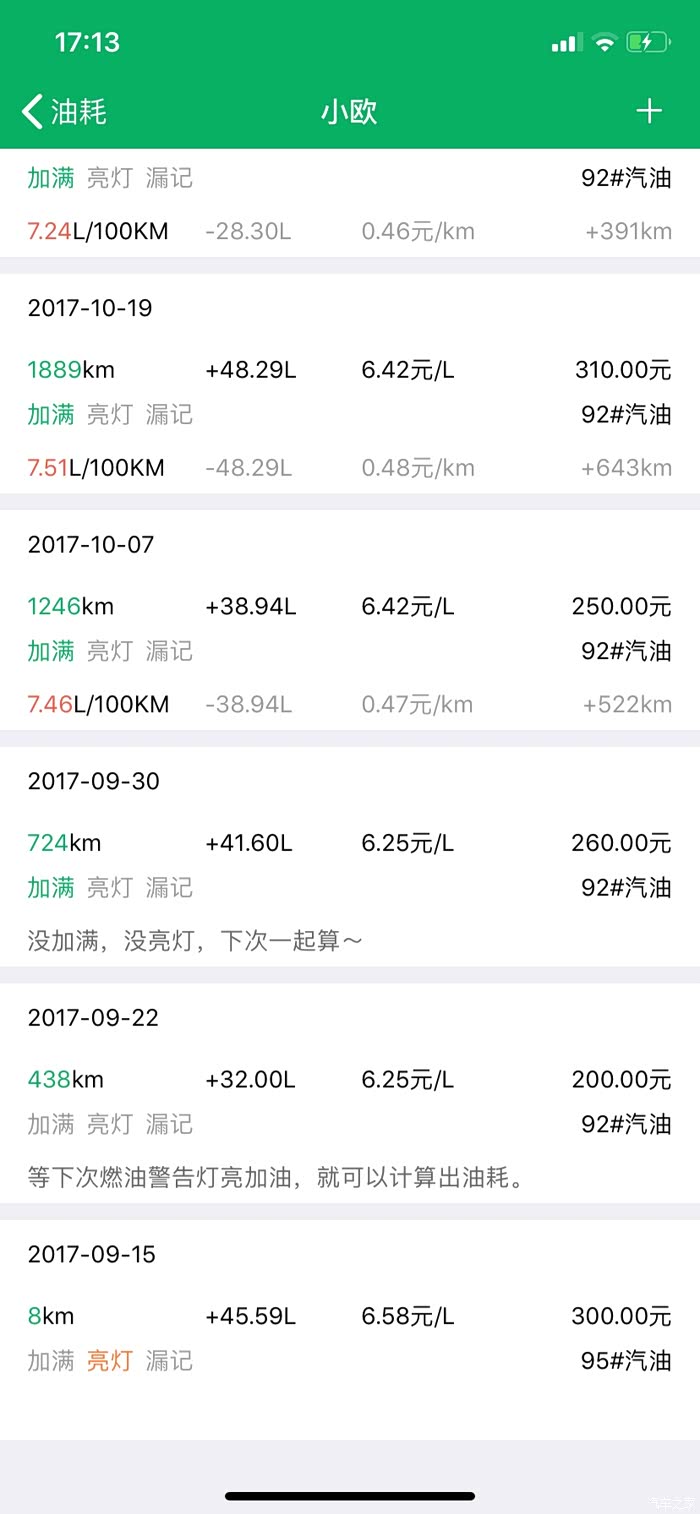 2017-9-15第一次加95#汽油,以后都是加92#汽油