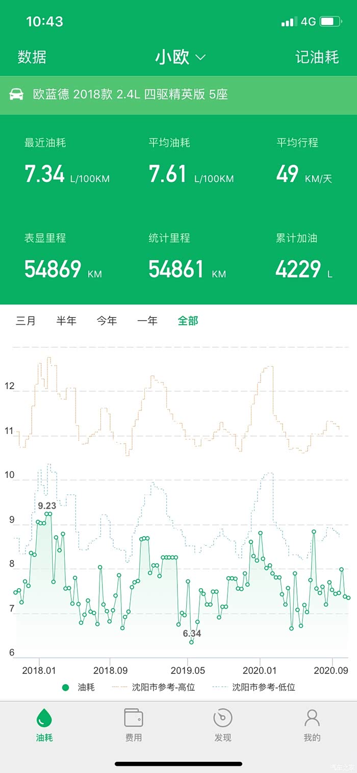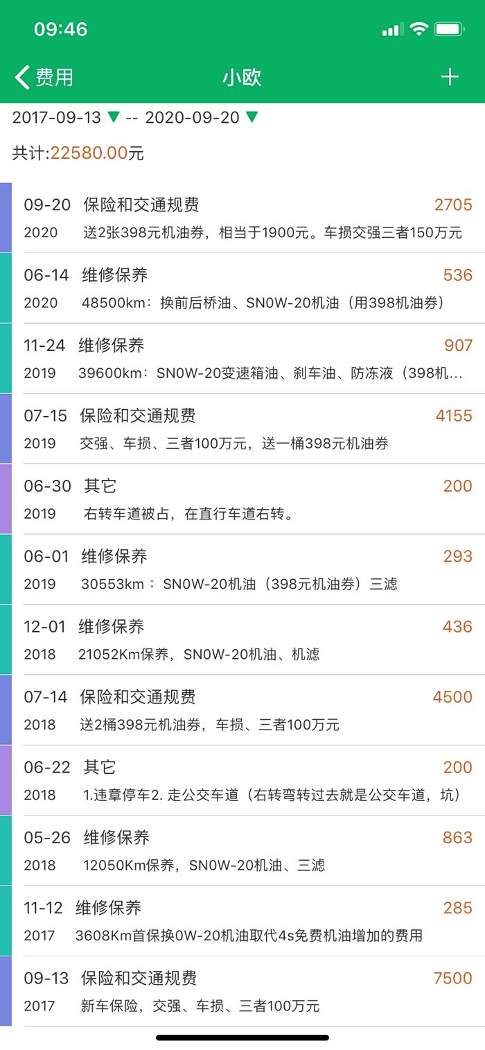 从2017年9月15日提车(2.4四驱五座,9月13日办好手续),目前行驶55000km,每次加油均作记录,计算平均油耗7.61L/100km,仪表盘车显M值7.2L/100km,看来M值偏高0.4L/100km。总费用支出56000元,油费28000元,参考下方图片。下面闲话3年行车用车感受: