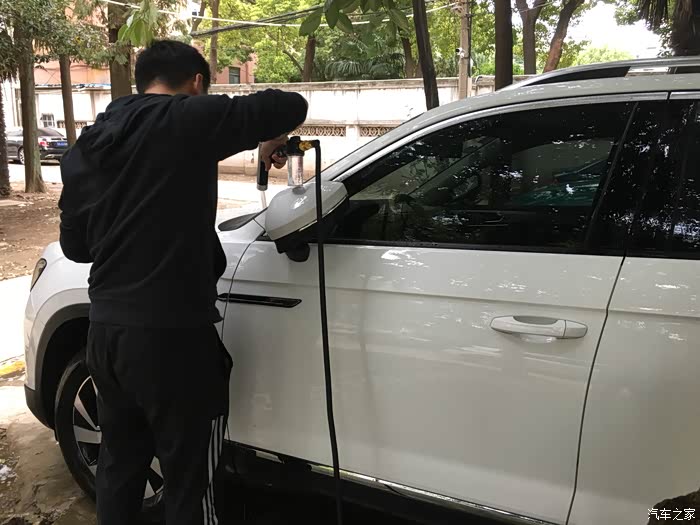 水枪下面有一个小盒子,里面可以加点清洁剂,整个车身喷上水和清洁剂,无润滑下,不然不好擦。