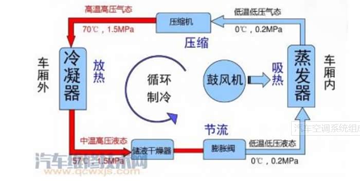 在制冷时就比较复杂了,按下ac按键后,压缩机离合器结合,发动机开始带动压缩机旋转,压缩机不断压缩制冷剂。制冷剂被压缩机压缩后会送到蒸发器内,那么蒸发器被制冷剂冷却,同时蒸发器再冷却鼓风机吹过来的空气,这样出风口就可以吹出冷风了。
