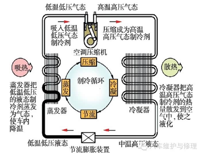 首先和大家聊一下空调以及暖风的工作原理!汽车空调制热时是利用冷却液的余热,制冷时是利用制冷剂的形态转换。