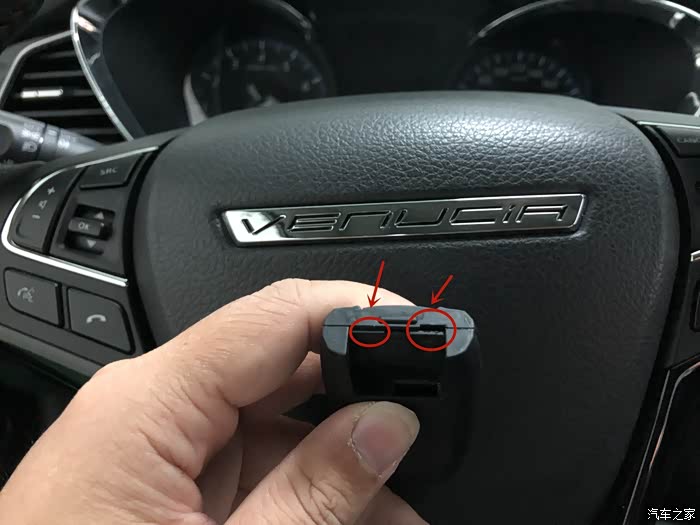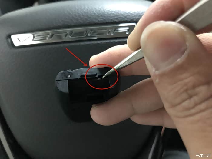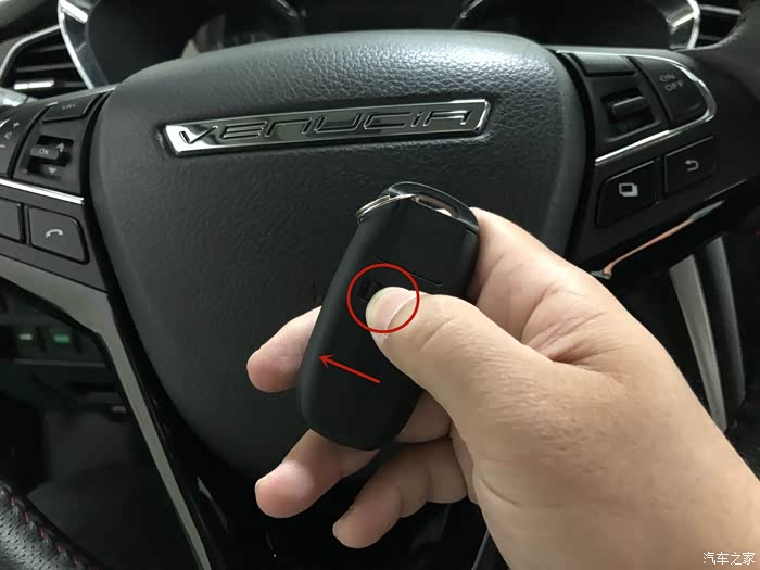 找到电子钥匙背面小卡扣,往左边轻轻推一下。